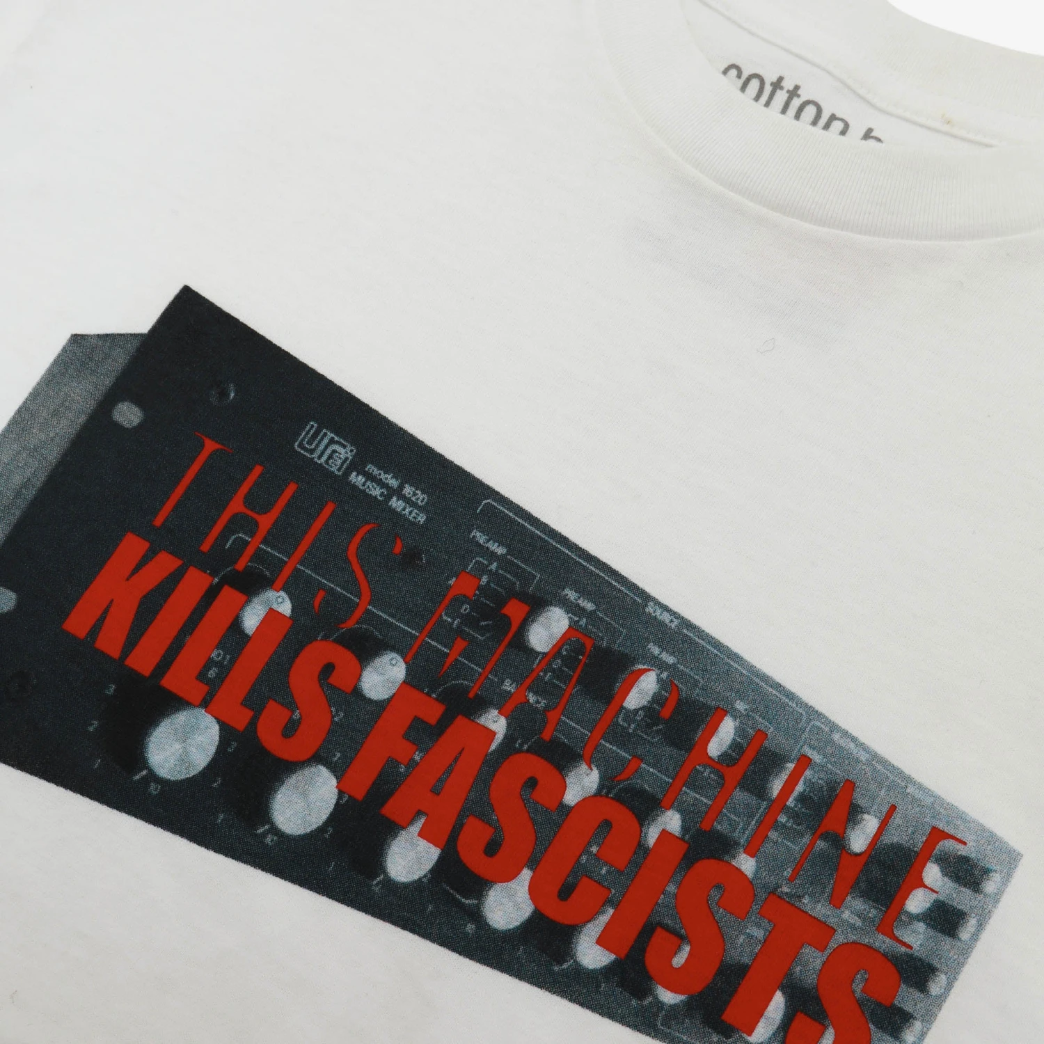 A highly collectable T-shirt from Japanese brand Goodenough. Released in 2005, it features Woody Guthrie’s famous slogan, This Machine Kills Fascists, over an image of Urei’s rare 1620 mixer.Â